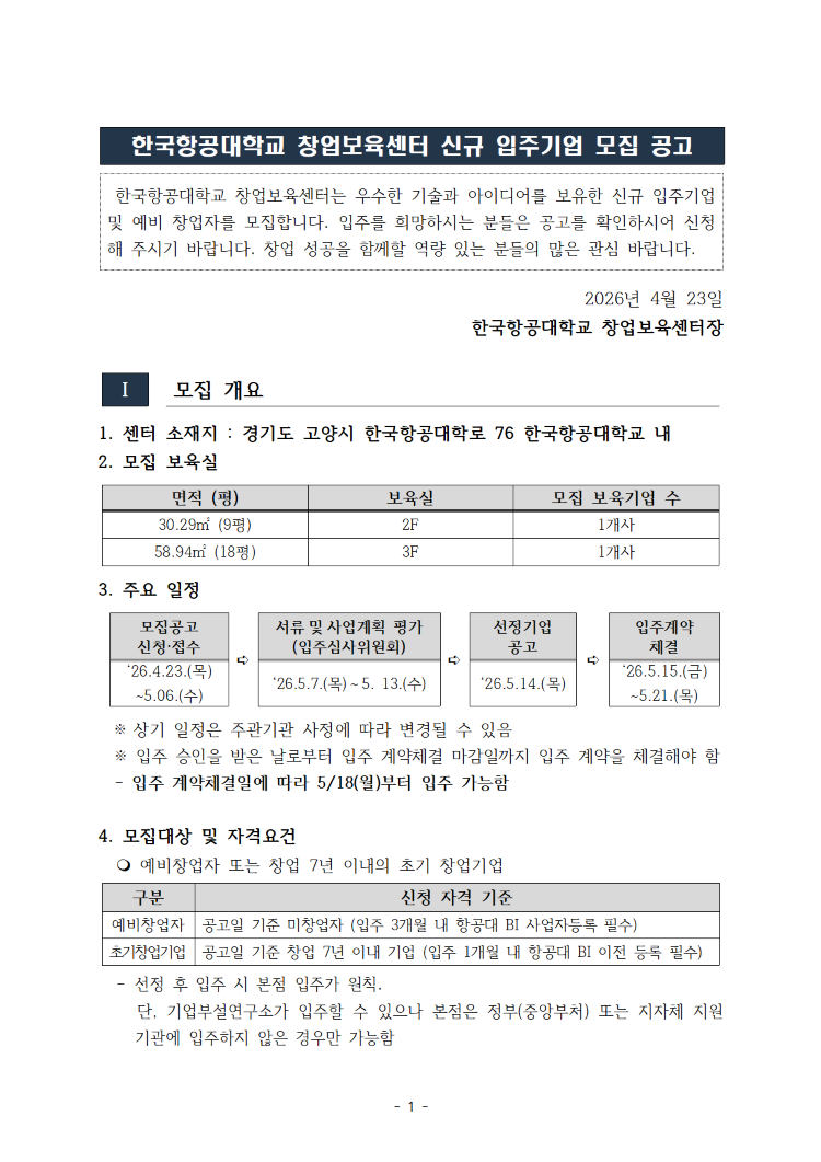 첨부파일 1 한국항공대학교 창업보육센터 신규 입주기업 모집 공고문.hwp (4 Mbyte)