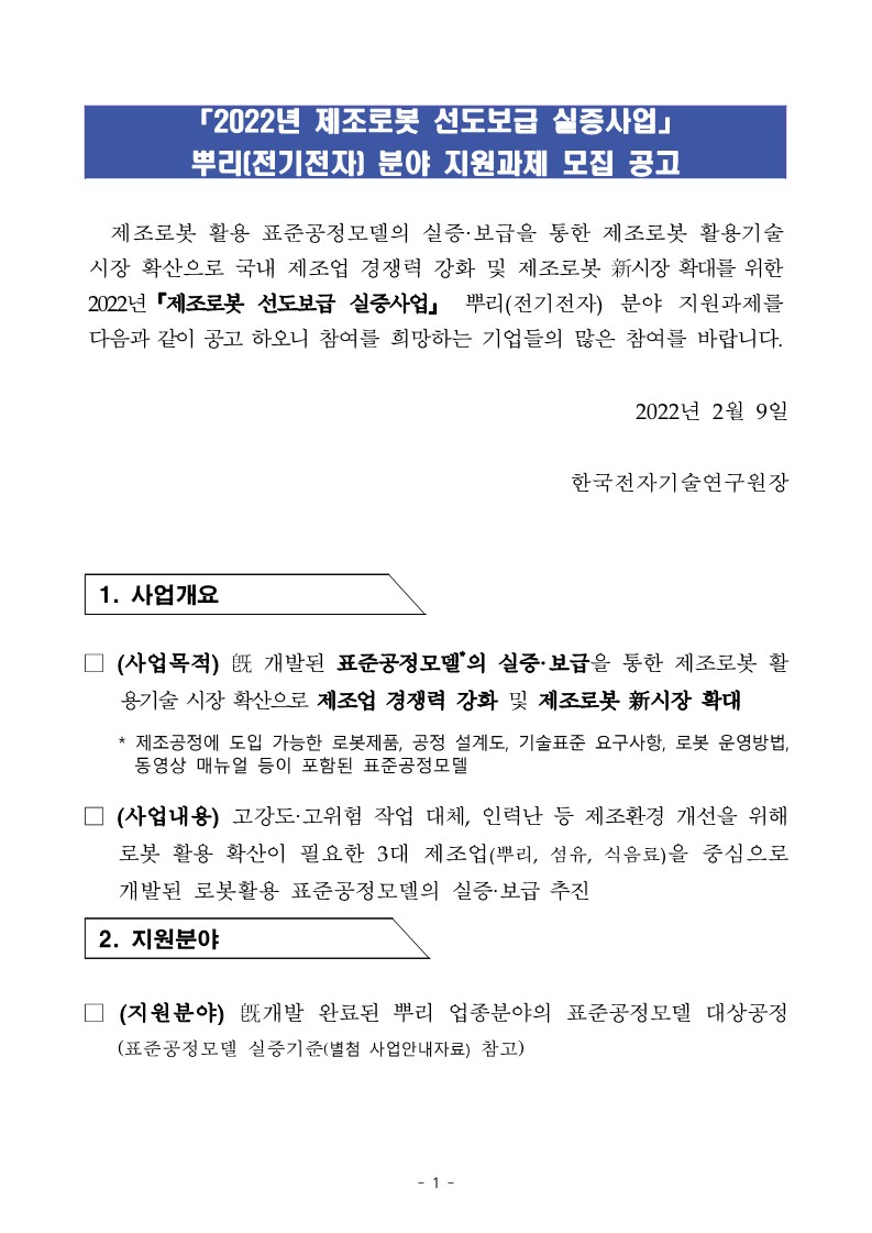 「2022년 제조로봇 선도보급 실증사업」 뿌리(전기전자) 분야 지원과제 모집 공고