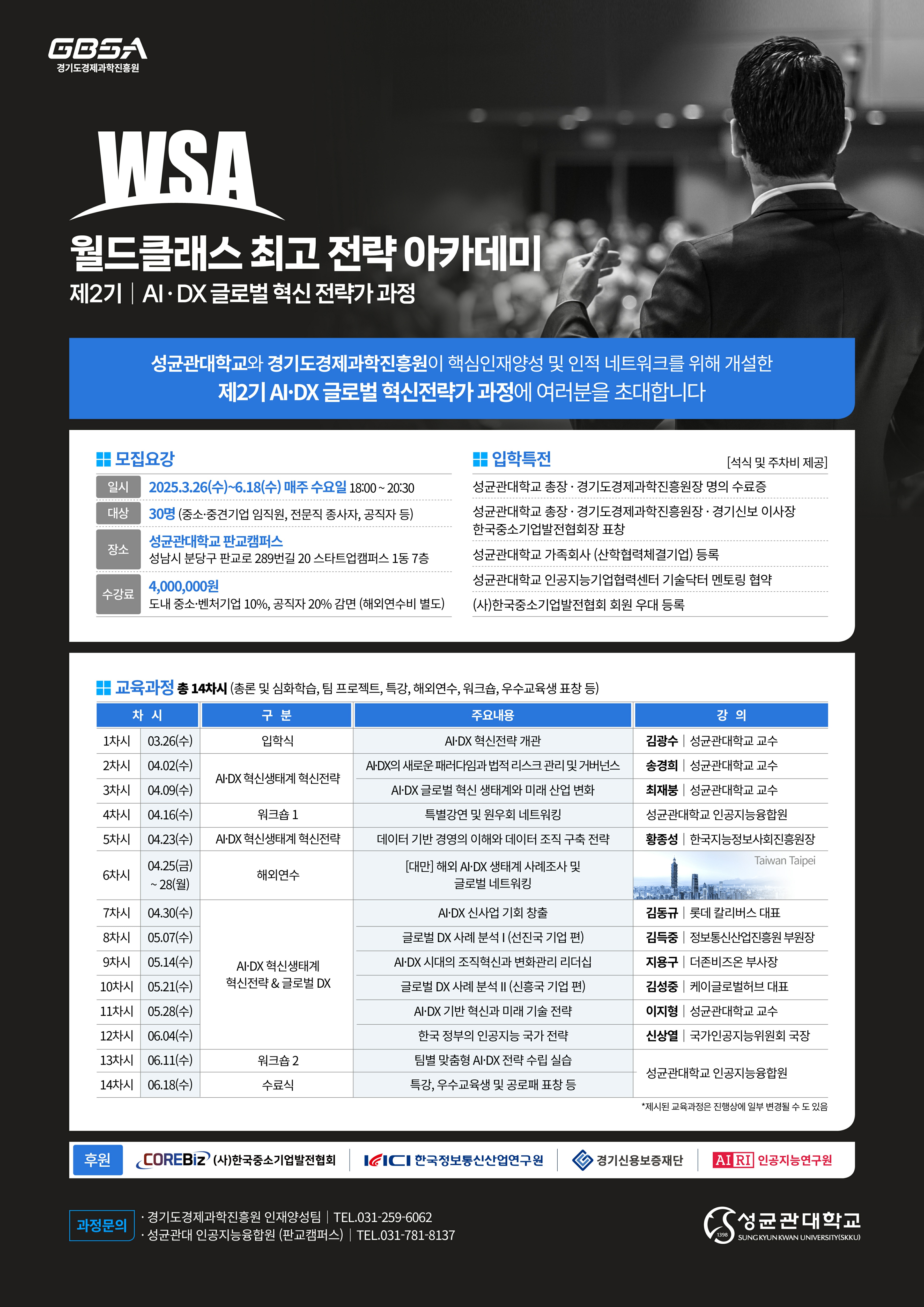 경기도경제과학진흥원과 성균관대학교은 도내 중소·벤처기업 및 정부기관 등 차세대 글로벌 리더 육성을 위한 월드클래스 최고 전략 아카데미(과정명:AI/DX 글로벌 혁신 전략가 과정)를 운영하고 있습니다.